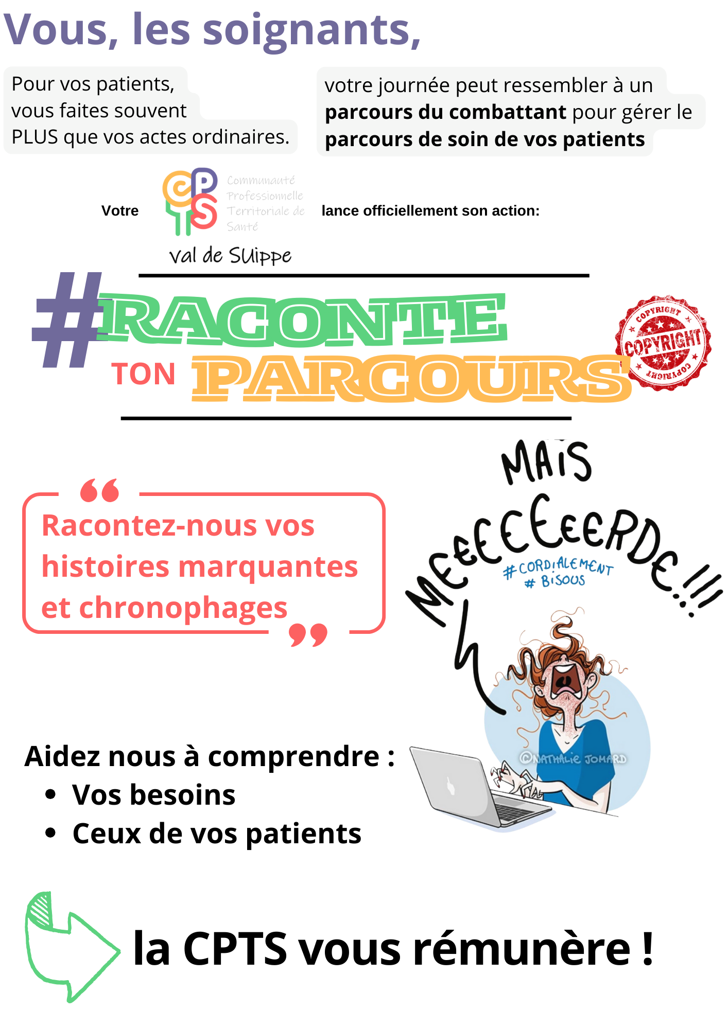 Pour participer, rien de plus simple: Vous cliquez sur le bouton ci-dessous et vous vous laissez guider par le questionnaire ; votre réponse est bien enregistrée et nous pourrons démarrer rapidement son étude. Florent Mauget est à la manœuvre avec la coordination, et tout pro de santé qui veut bien s’y intéresser. Ou bien, vous appelez Claire au 0687194443, ou vous lui envoyez un message par pigeon voyageur !