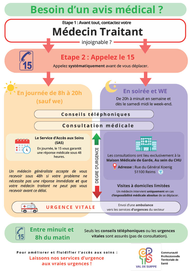 ⚠️ Rappel important : Entre minuit et 8h, il n’y a plus de consultations physiques. Seuls les conseils ou les urgences vitales sont gérés par le 15.